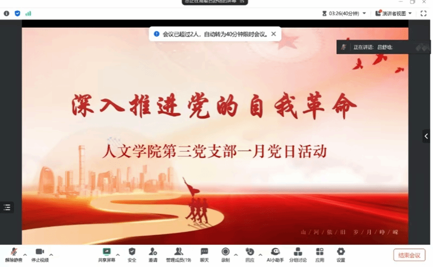 为积极响应党的号召,深入学习贯彻习近平总书记关于党的自我革命的重要思想,2025年1月17日晚上,樱花小说 学生第三党支部在线上开展了“深入推进党的自我革命”主题党日活动。本次活动由吕舒晗同志和陈嘉乐同志主持。