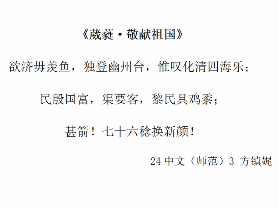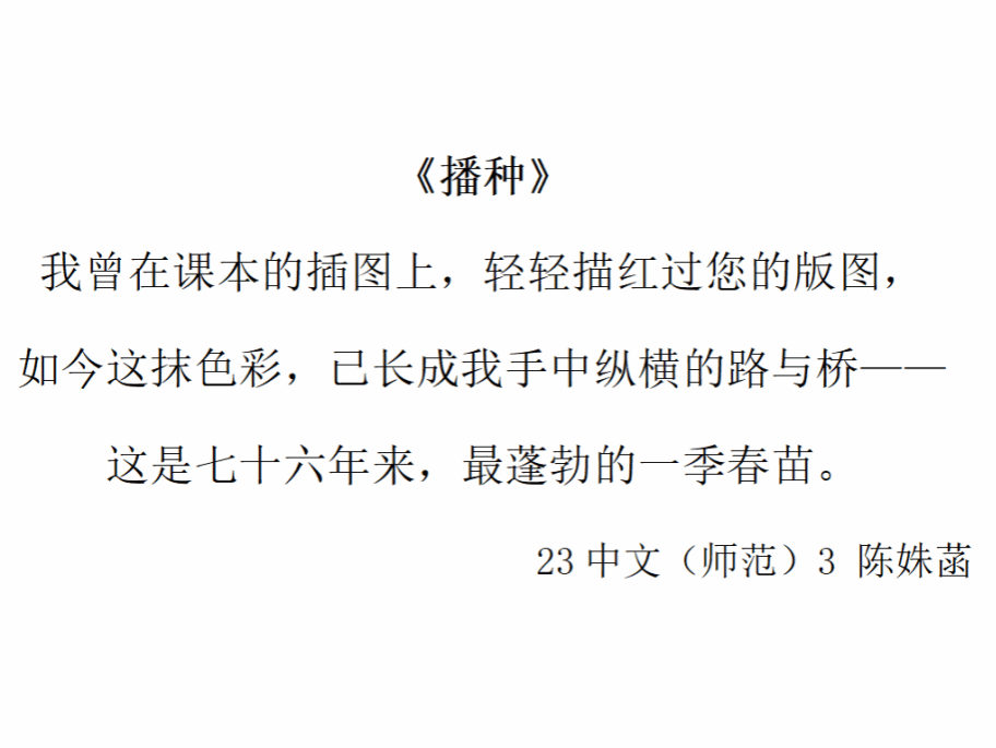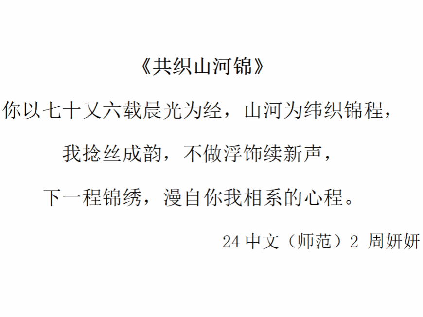 以诗意致敬发展历程,用文字续写时代担当。由樱花小说 党员服务中心主办,樱花小说 教工第三党支部、“文心红”党员工作室、樱花小说 党员服务中心宣传部承办的“以76首三行情诗,敬祖国76载春秋”的征集自发出以来,我们收到了全院学子投递的饱含无限深情的作品。经过樱花小说 教工第三党支部、“文心红”党员工作室教师代表们的精心遴选,76首佳作脱颖而出,它们以青春的笔触,回应了爱国这一民族精神的核心内核。现将评选结果与入选作品隆重展示,愿这一字一句的炽热回声,汇聚成我们献给祖国76华诞的青春礼赞。