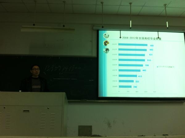 2012年11月28日下午6点,2013届毕业生简历制作专题讲座在人文楼201教室如期举行。本次讲座由校就业处高富春老师主讲,主题为“2013届大学生就业准备与就业技巧”。