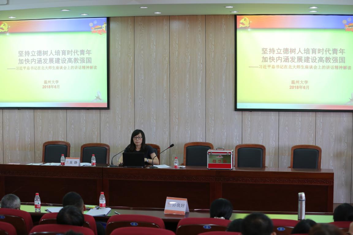 吴静书记为全体教职工做了题为“坚持立德树人培育时代青年,加快内涵发展建设高教强国——习近平总书记在北京大学师生座谈会讲话精神解读”的学习报告。她首先对习近平总书记历次考察北京大学的情况进行了简要回顾,然后围绕“我们要培养什么样的人”、”怎样培养我们需要的人”、“青年怎样成为这样的人”三个问题,从我国高等教育的一个根本任务、建设中国特色世界一流大学的三项基础性工作和对新时代青年的四点希望三个方面重点对习近平总书记在北大师生座谈会上讲话要点进行了解读。最后从学习习近平总书记讲话精神要自觉增强五个自觉的角度对深入学习贯彻习近平总书记讲话精神提出了具体要求。