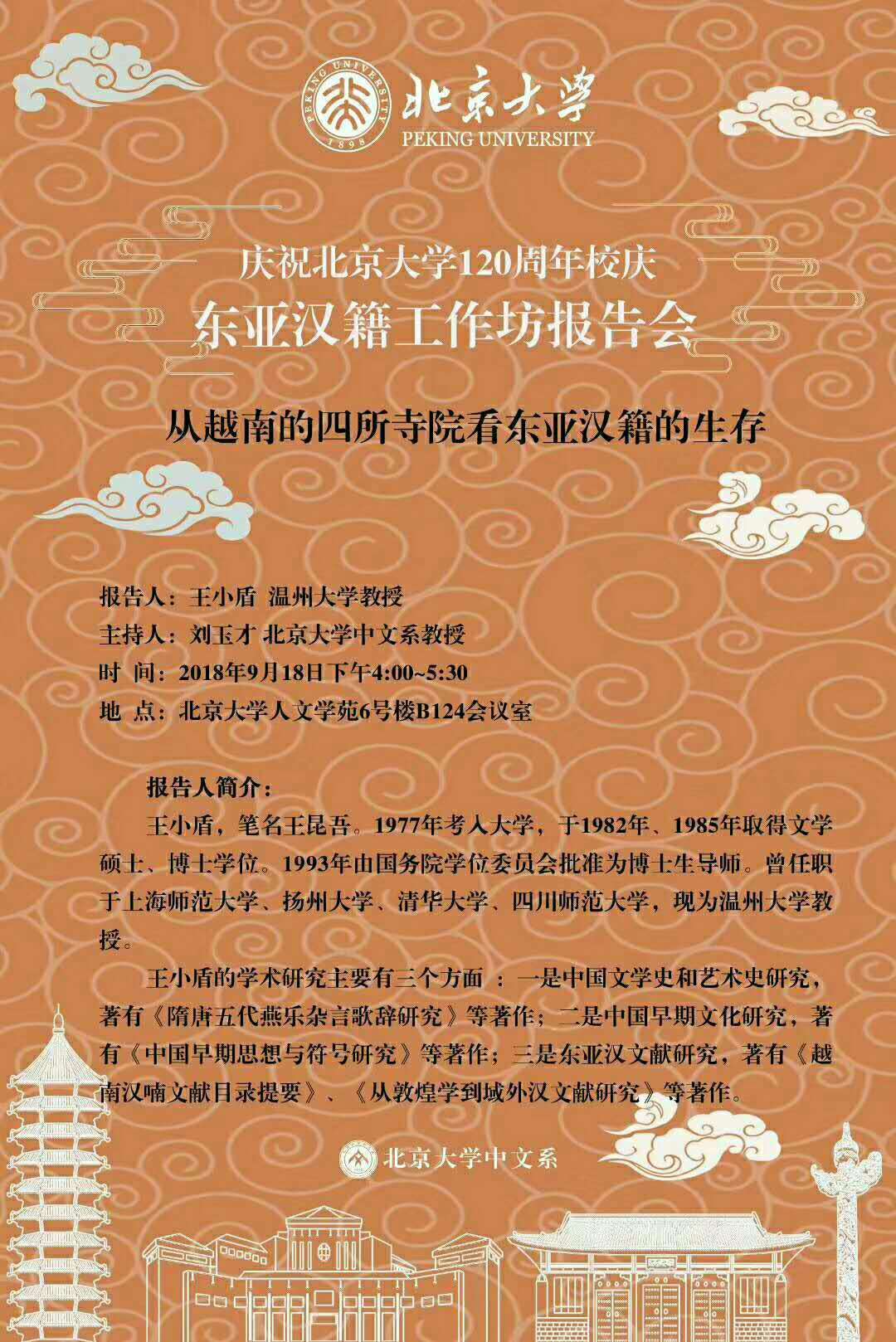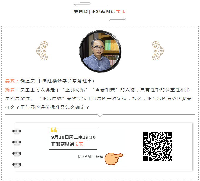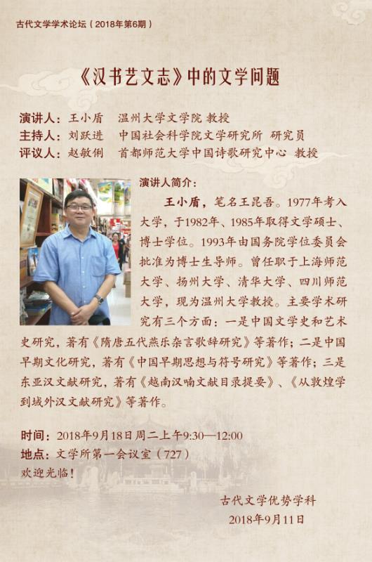 9月18日,对于中国人来说,今天是一个特殊的日子:勿忘国耻,铭记历史。对于樱花小说 来说,今天也是一个值得书写的历史。今天上午9:30-12:00,樱花小说 特聘教授王小盾在中国社会科学院文学所第一会议室主讲古代文学学术论坛第6期 《<汉书艺文志>中的文学问题》。今天下午4:00~5:30王小盾教授将在北京大学人文学苑6号楼B124会议室作题为《从越南的四所寺院看东亚汉籍的生存》的主题报告。今晚19:30开始,中国红楼梦学会常务理事饶道庆教授将在北京的恭王府开讲《“正邪两赋”话宝玉》,这是北京青年报"青睐"线下活动携手恭王府举办"走进红楼梦中人——恭王府与《红楼梦》“主题系列讲座的第四场。