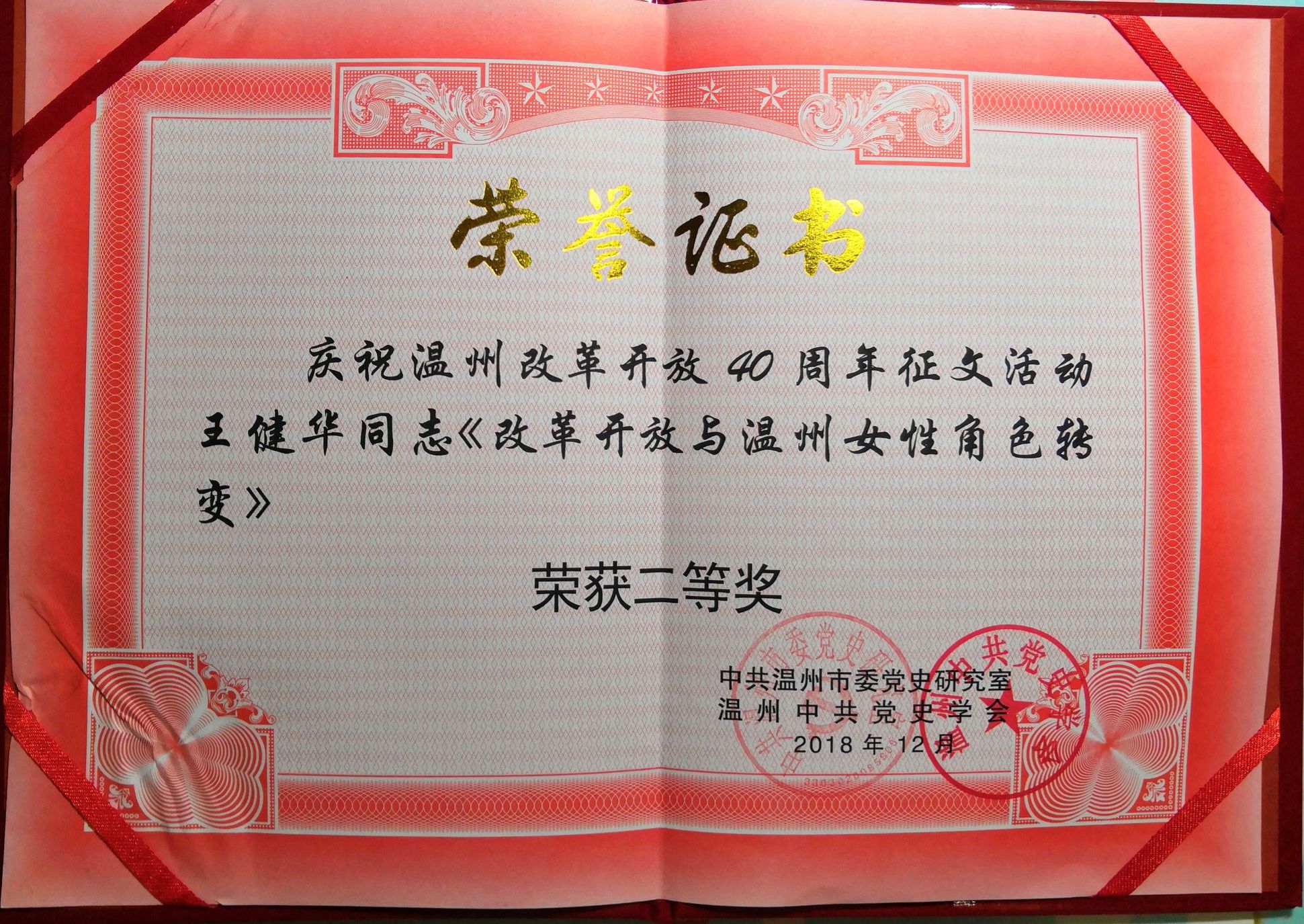 2018年12月27日上午,由温州中共党史学会、温州市新四军历史研究会召开的庆祝改革开放四十周年征文活动颁奖大会于温州市工人文化宫举行。温州中共党史学会、温州新四军历史研究会会长乔吉林,市委党史研究室(市志办)主任赵降英,原温州市委副秘书长谢浩等出席此次颁奖仪式。