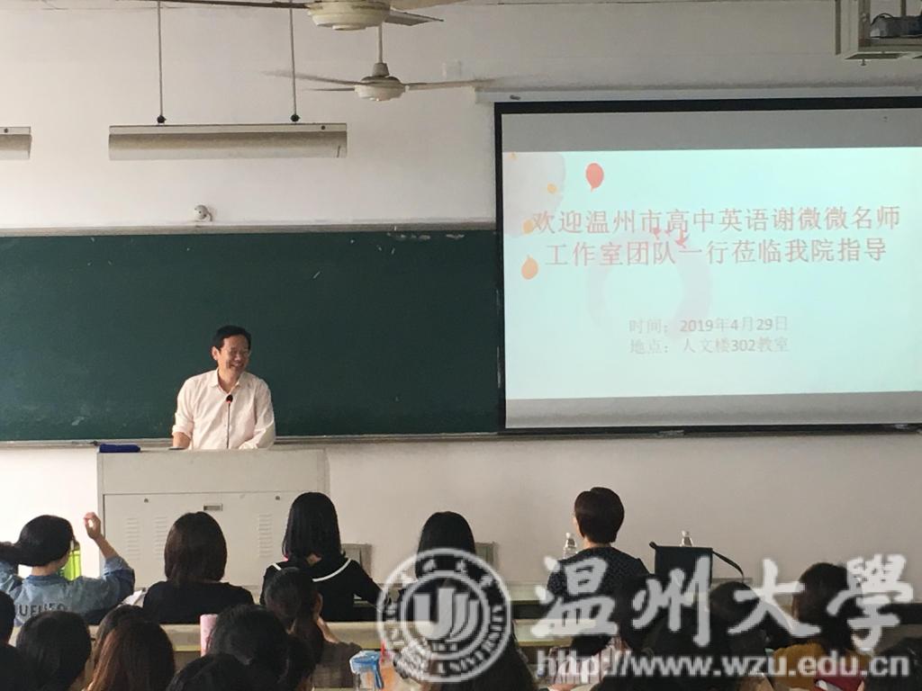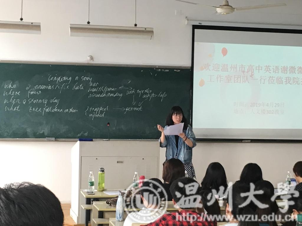 2019年4月29日到5月8日,以温州中学教授级高级教师谢微微为负责人,包括温州中学蔡丽丽老师、蔡夏冰老师、蔡珍瑞老师、丁丽芸老师、李晶老师、麻晨晨老师、钱盈老师、许少秋老师、叶彬彬老师、张倩老师、赵天红老师、朱婷婷老师,以及温州第十四高级中学谢津津老师等在内的谢微微名师工作室为樱花小说 16级英语(师范)专业学生开设“教师资格证工作坊”特色实践课程。谢微微老师是樱花小说 英语(师范)专业优秀校友,毛继光副院长代表外国语学院,既表达了对老师们表示了热烈欢迎,也提醒同学们要抓住这次难得的学习契机。该课程由李宋昊老师和薛丽芳老师负责。