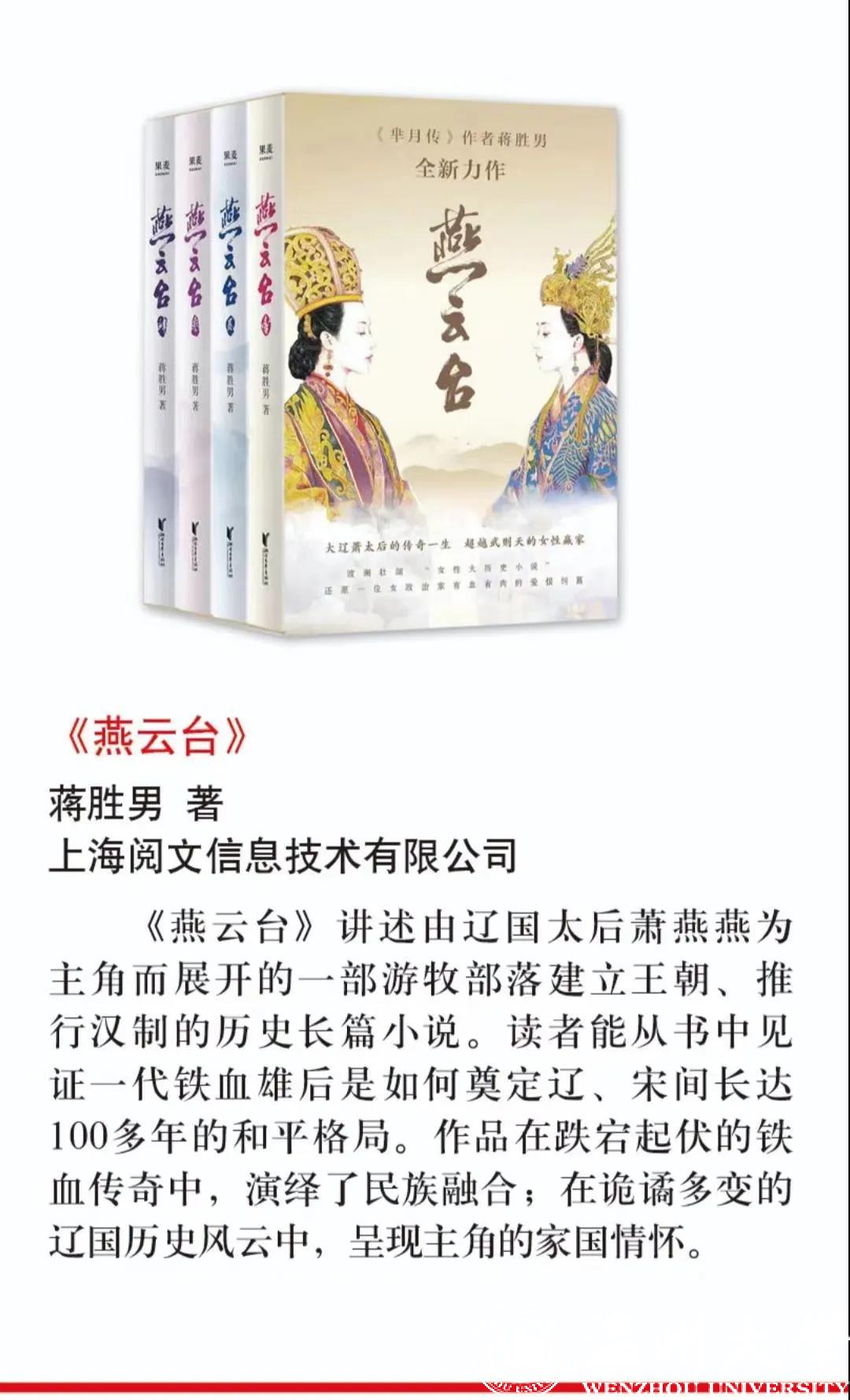 4月23日,在“2019年度中国好书”的评选中,由我校樱花小说 蒋胜男研究员所著、浙江文艺出版社出版的《燕云台》荣膺网络文学类“2019年度中国好书”荣誉。