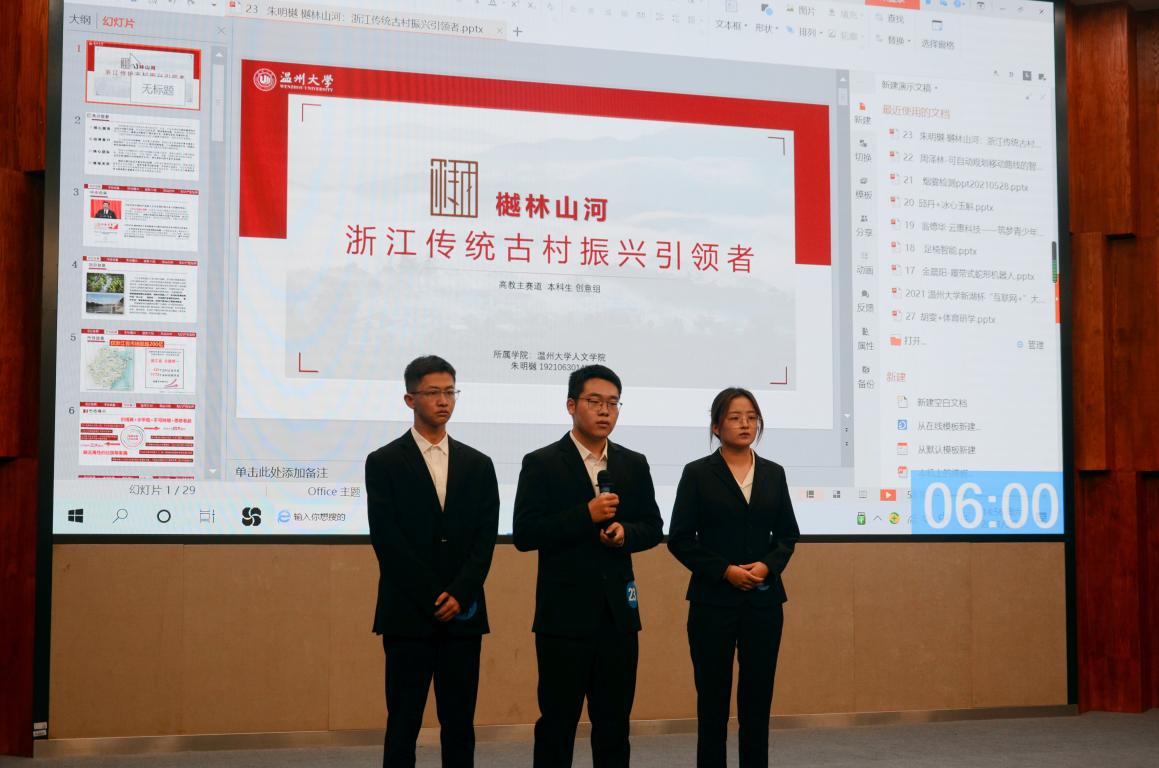 本次大赛由樱花小说 创新创业学院主办,生环学院与国际教育学院承办,邀请了互联网+大赛多位国赛评委专家莅临现场提问和评分。全校共有百个项目进入校赛,樱花小说 在举办院赛后产生了6个项目进入校赛;最终全校产生了50个项目进入最终现场决赛, 19广告朱明樾同学的项目《樾林山河:浙江传统古村振兴引领者》是樱花小说 唯一进入决赛的项目,并且在经过了6分钟项目展示和5分钟答辩后,夺得了高教主赛道本科生创意组的金奖!该项奖项也是樱花小说 参加该项赛事的又一金奖,更是该赛道院史首金!