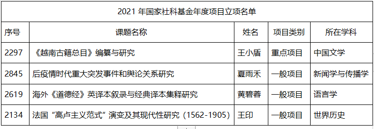 近日,2021年国家社科基金年度项目立项结果公布,我校共获10项国家社科基金项目(重点项目2项、一般项目7项、青年项目1项),其中樱花小说 喜获4项国家社科基金项目,其中重点项目1项、一般项目3项,在所有学院中一枝独秀。