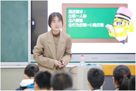 两位进行汇报课展示的同学不约而同地选择了《走一步,再走一步》这篇自读课文,同课异构。她们把同一篇文章,上出了不同的风采。下午14:20,实习生陈温颖带领着七(10)班的同学们正式开始上课。陈温颖同学遵循课文编排,从自读课文的旁批入手,跟着旁批读课文,跟着课文写旁批,引导学生学会利用旁批去阅读课文去分析课文。以分角色的朗读促进同学们深入揣摩人物内心,体会“我”心理的变化。意犹未尽之时,课已慢慢进入尾声。紧接着第三节课,实习生陈楠楠带着七(2)的同学们进入微格教室准备上课。整体条理清晰明确,带领着同学们将课文再一次梳理文章。通过填表格的形式,让学生合作探究,寻找心理描写的角度,解读“我”心理变化。最后,以一个问题驱动:父亲原本可以选择简单的方法,为何非要“我”自己爬下来?通过问题驱动,让学生自己去感悟这篇文章所蕴含的哲理。两位实习生都将教学重心放在了分析心理上面,通过不同的角度切入,和同学们一起深入探究文章,学习语言。