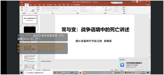 在4月19日下午,省教坛新秀黄惋莉老师通过视频录播的方式带来了《常与变:战争语境中的死亡讲述》的主题讲座以及微讲座《关于情景的思考》。黄惋莉老师分享了自己在中学语文教学中的经验,谈到了语文教学中的情境设定的问题,指出情境设定应当具备实用性、复杂性、真实性等特征,强调了“真实情境”的重要性,情境应当指向对学生语文学科本体认知能力的提升。