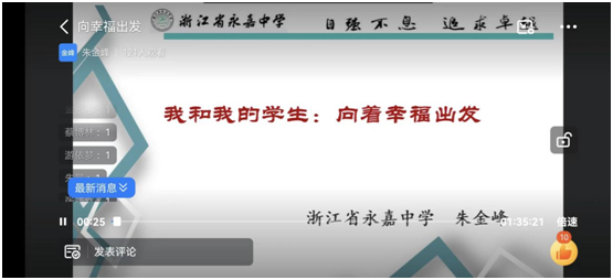 研习进程过半,而同学们热情不减。在4月19日上午,浙江省正高级班主任朱金峰老师通过线上的形式举办了《我和我的学生:向幸福出发》的主题讲座。朱金峰老师谈到了对教师和班主任角色的理解,详细说明了教师职业发展因素之间的内生影响,充分体现了她以学生为主体,以教师为主导的教学理念,为同学们的生涯规划指明了方向,使同学们获益良多。