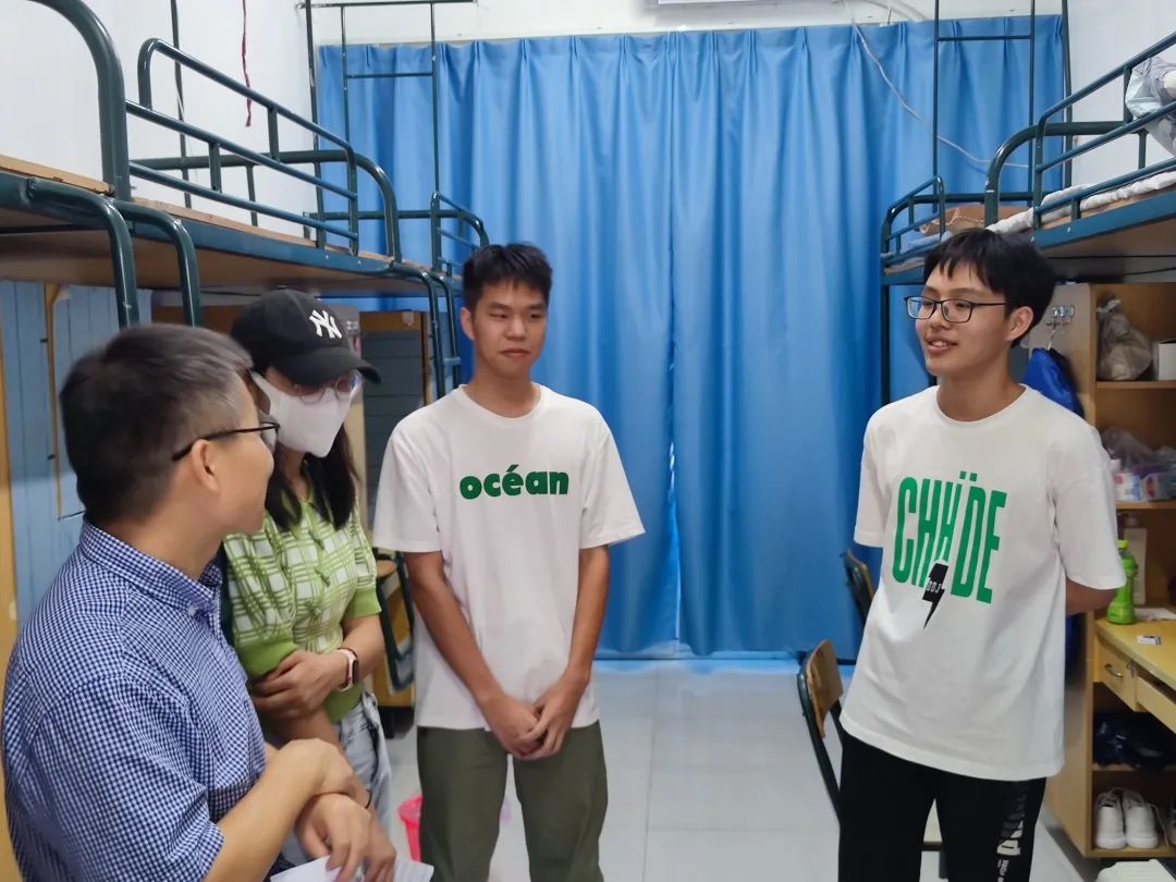 院党委书记江秀景仔细地询问同学们的报到情况、住宿情况、新环境适应情况以及未来目标等,鼓励同学们要以积极的心态站在新的起点,树立远大理想,学好专业知识,培养家国情怀,立志做无愧于新时代的大学生,在未来有所发展、有所作为。同学们积极回应,表示了对老师走访的感谢。