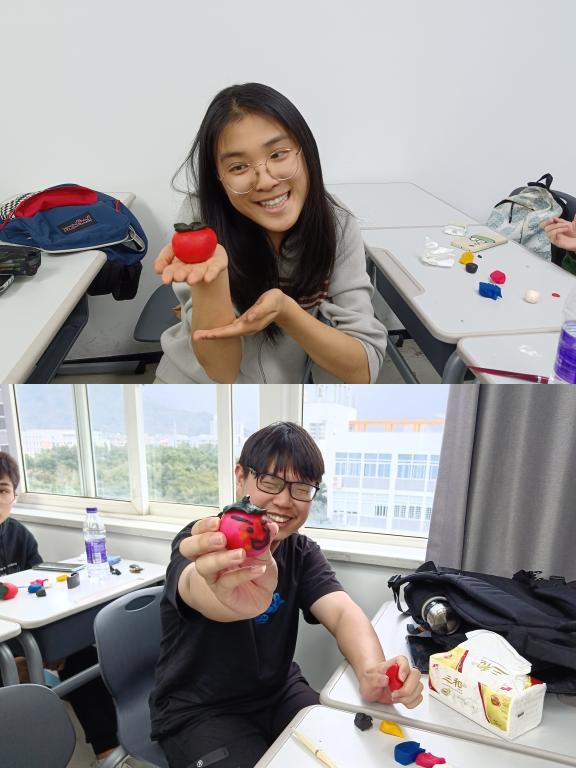 揉、捏、掐、剪、刻、挑……同学们跟着老师的讲解,一步一步,一点一点,细致耐心地捏塑,一件完整的“柿子”作品终于制作成形。