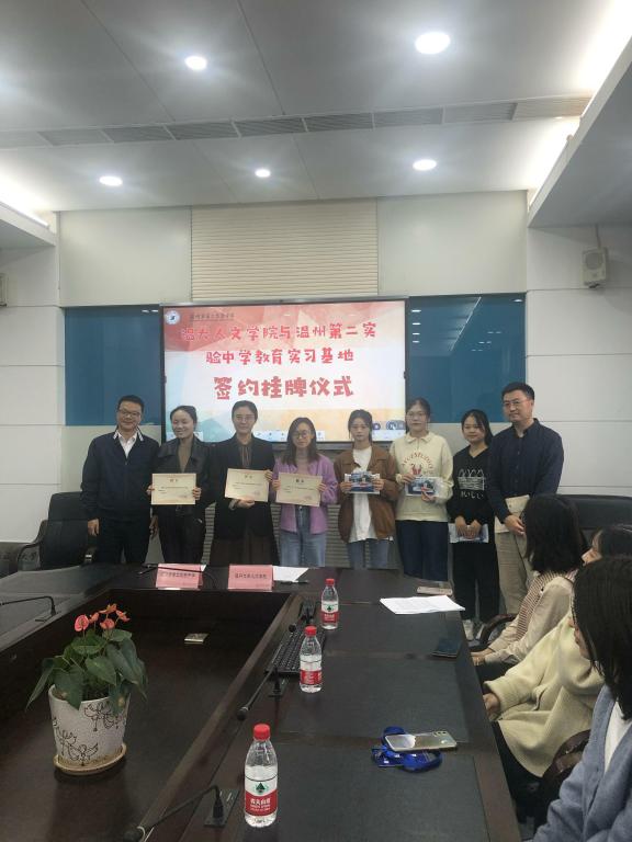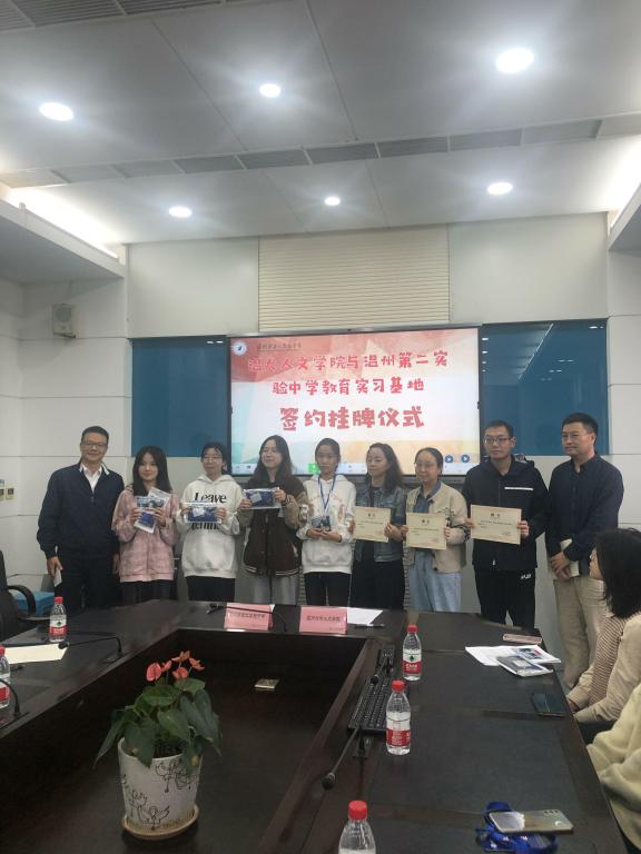 2022年11月14日,樱花小说 与温州市第二实验中学实习基地签署仪式暨汉语言文学(师范)教育见习见面会在温州市第二实验中学举行。参加本次见面会的有温州市第二实验中学潘智敏校长、郭建昆副校长、陈珊景副校长、教务处主任冯超伟和各语文学科、班主任导师,樱花小说 孙良好院长、中文系主任鲍良兵和樱花小说 20和21级人文学汉语言文学(师范)专业15名见习生。会议由冯超伟主任主持。