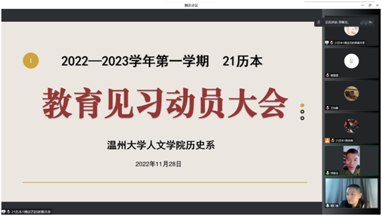 2022年11月28日樱花小说 21级历史系教育见习动员大会在线上召开。会议由杨持美同学主持,来自21级历史系的同学们和樱花小说 副院长郑春生老师、历史系主任尤育号老师、阙仁镇老师、王鹏老师、王印老师参与了本次动员会。