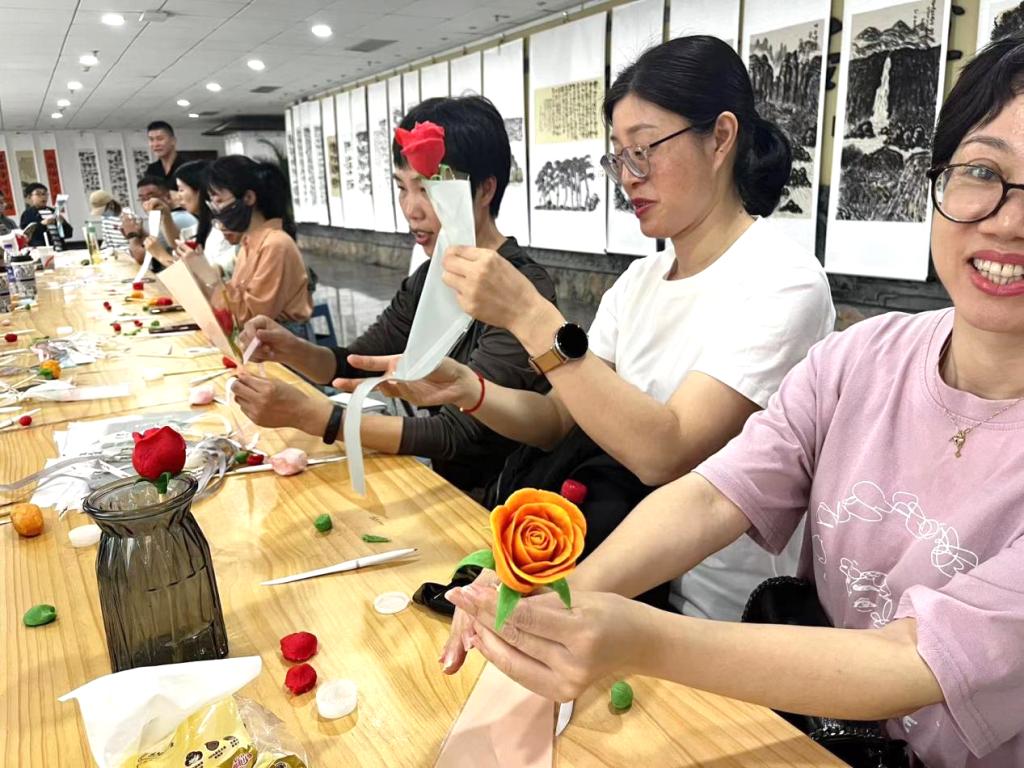 在参观完民俗馆后,万老师为大家请来温州米塑传承人周红燕老师,带领大家亲身感受温州非遗文化。周老师给学员们讲解了温州米塑的历史渊源及制作技巧。通过手把手教导,用各种颜色的米粉,以揉、捏、掐、刻、扮等手法,带着大家制作出一朵朵美丽的玫瑰花。在结束时,每位学员都用自己的“巧手”捏出了一朵朵玫瑰花。大家纷纷表示,这种能够带领自己动手劳动实践的课程真是太有意思了!