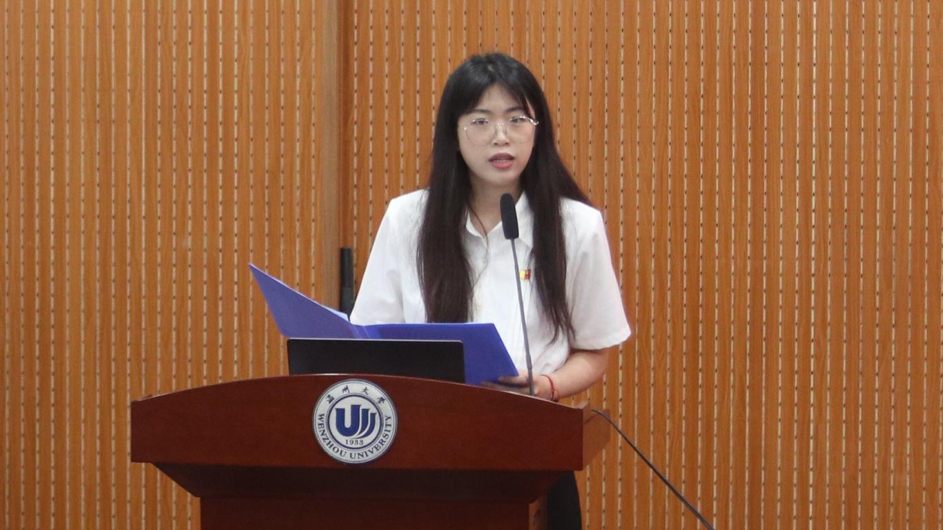 接下来由三位学生代表依次发言。首先,21学科教学(语文)专业的研究生章溢琦作为优秀党员代表发言,作为青年党员,要强理论、筑信念;争创新、勇追梦;践初心、担责任;当先锋、争先行;学用结合、勇于担当,努力为学院的党建工作做出贡献。