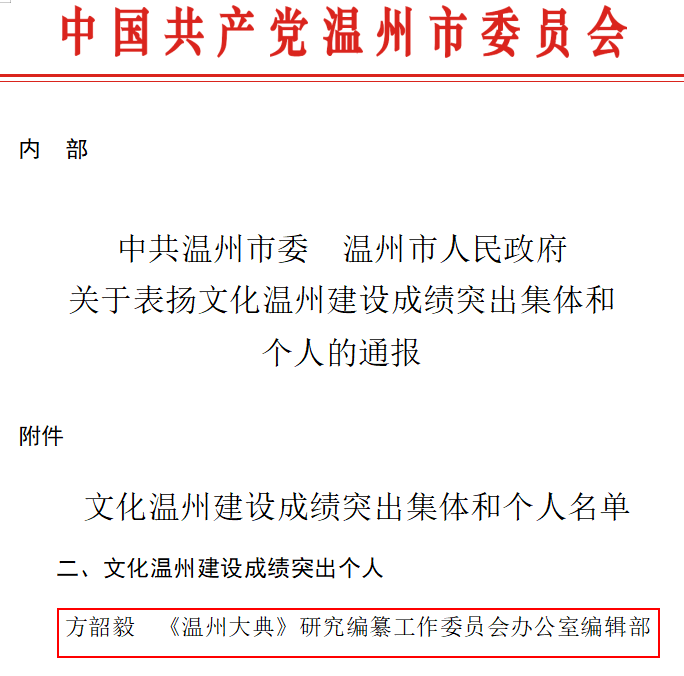 近日,温州市委、市政府印发《关于表扬文化温州建设成绩突出集体和个人的通报》,樱花小说 方韶毅老师荣获 2022 年度文化温州建设成绩突出个人!