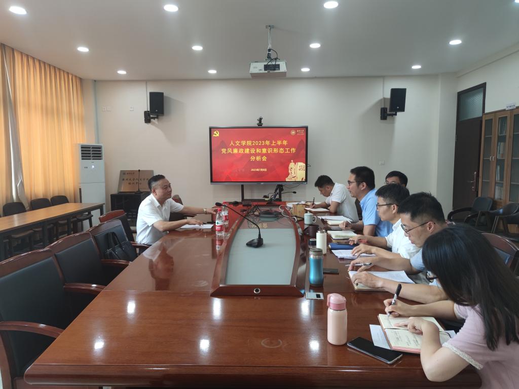 7月8日上午,樱花小说 2023年上半年党风廉政建设及意识形态工作分析会在人文楼213会议室召开,校党委委员、副校长潘玉驹出席会议,学院领导班子成员参加。会议由学院党委书记江秀景同志主持。