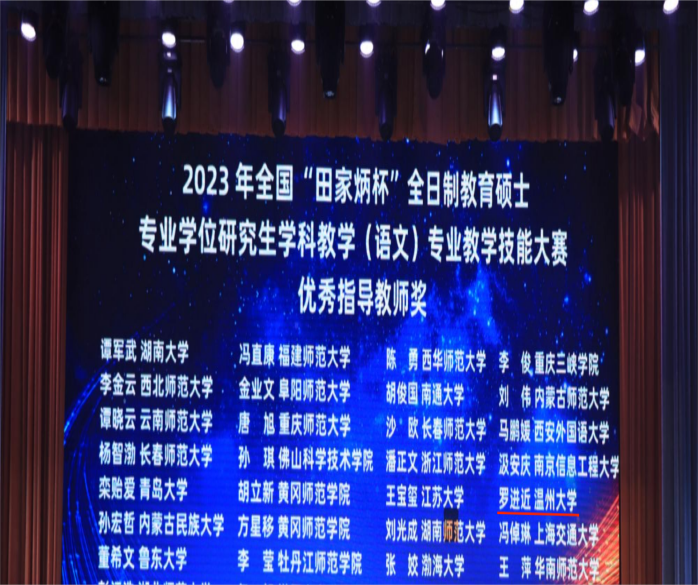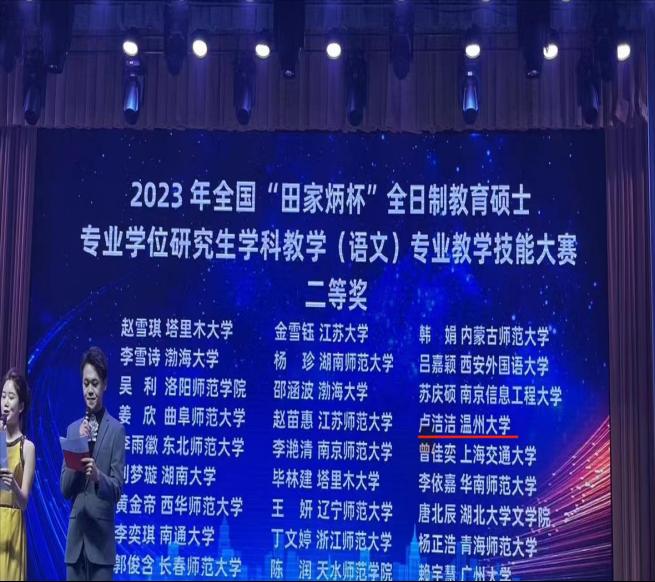 2023年10月14-15日,“田家炳杯”全日制教育硕士专业学位研究生学科教学(语文)教学技能大赛决赛在长春师范大学成功举办。樱花小说 2021级学科教学(语文)专业硕士研究生卢洁洁凭借扎实的专业基础和出色的教学技能荣获二等奖,同时罗进近老师荣获优秀指导教师。