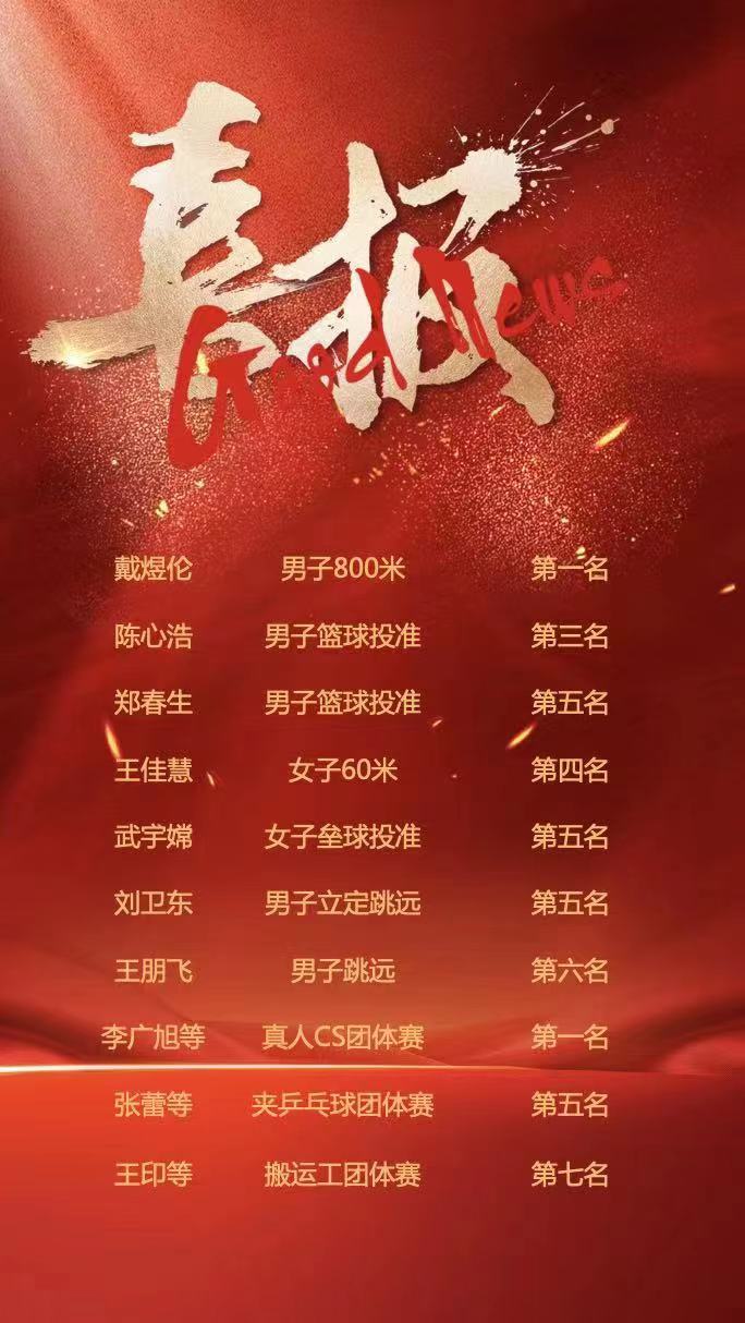 樱花小说 教工积极参加各类运动项目,报名人数38人,创造历史新高。教工运动员奋力拼搏,挥洒汗水,荣获教工团体第六名及体育道德风尚奖。团体赛方面,李广旭、刘炳林、王佳慧、张丹妮、刘恭宇、王朋飞等参与的真人CS项目获得第一名,刘炳林、李红梅、张蕾、侯崇仙、王佳慧等参加的夹乒乓球项目获得第五名,王印、王鹏、王长命、刘炳林、戴煜伦等参与的搬运工项目获得第七名。个人赛方面,戴煜伦获得男子800米第一名,陈心浩、郑春生分获男子篮球投准第三名、第五名,王佳慧获得女子60米第四名,武宇嫦获得女子垒球投准第五名,刘卫东获得男子立定跳远第五名,王朋飞获得男子跳远第六名。
