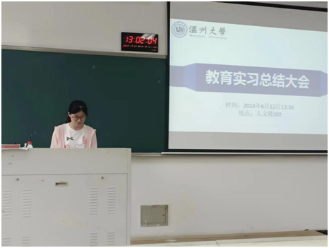 其次,温州市南浦实验中学锦绣校区实习点林桐安、樱花小说 附属榕园学校实习点郑子琰、平阳县鳌江中学实习点黄玉婷、瓯海区第一高级中学实习点周佳颖,分别从教育实习工作、日常生活、心得分享等方面介绍了各个实习点的具体情况,汇报了本次实习所取得的成果与收获。在实习过程中,各位组长认真负责,为同学们解决了许多实习中具体的问题,21历本的全体同学们也积极配合,踏实肯干,体现出历本人严谨认真的态度。