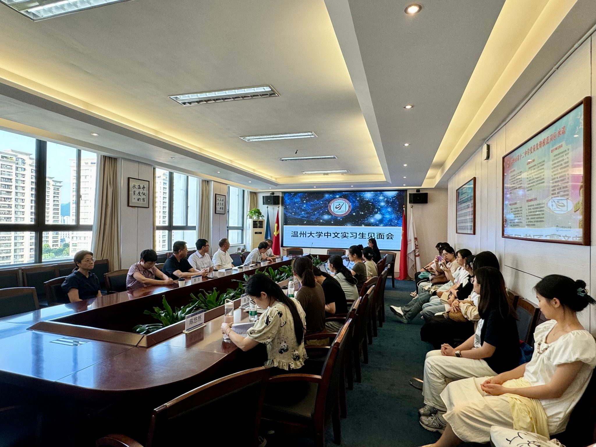 2024年9月9日下午16:00,温州市教育教学研究院附属学校教育集团学院路分校举行了樱花小说 21级汉语言文学(师范)专业教育实习见面会。会议上,集团校副校长张政、副校长邓权忠、八年级主任陈春棠、樱花小说 副院长陈鸿超、樱花小说 实习指导老师罗进近、郭垚,6位集团校指导老师,以及14位实习生共同参会,会议由集团校陈媛老师主持。