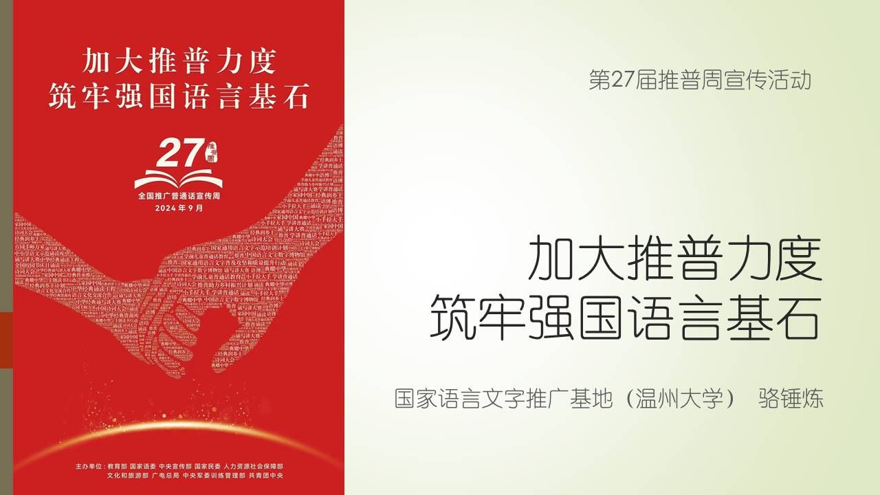 讲座分为两个部分。骆锤炼老师首先向同学们介绍了本届推普周的主题和活动背景,强调了推广普通话在促进民族团结、文化传承及社会发展中的重要作用。同时,骆老师介绍了我校国家语言文字推广基地的概况和近年来开展的相关活动,话语中,不仅透露出对语言文字工作的深切热爱,更寄托了对新生们成为未来普通话的积极推广者、语言文字文化的守护者的殷切期望。