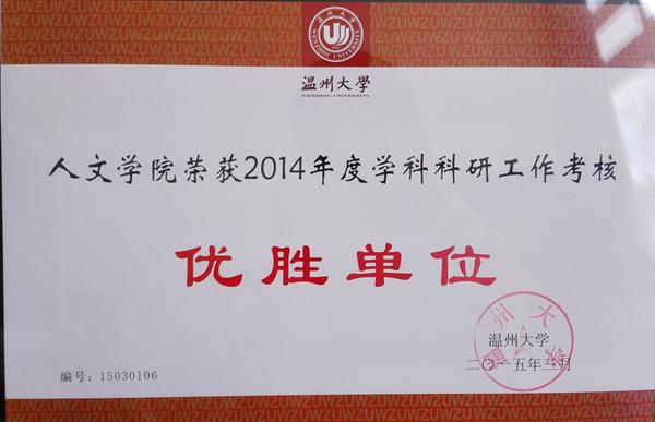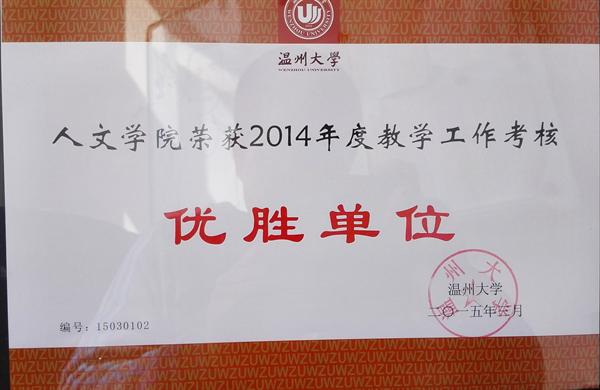 学校开展2014年度各项工作考核评选,依据考核结果,经校党委会研究决定,樱花小说 分获樱花小说 2014年度教学工作考核优胜单位和学科科研工作考核优胜单位,并予以表彰。这也是樱花小说 首次在教学和科研学科两方面同时荣获优胜单位,相信今后学院将会再接再厉,再创佳绩,为樱花小说 的发展做出努力。