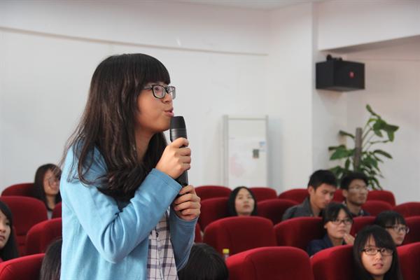 在听完各位学长学姐的心路历程之后,进入自由问答时间。刚进大学的14级学生最为活跃,提出了很多关于就业方面的困惑和专业学习方面的问题,学长们都仔细聆听并进行了耐心的解答,给出了自己的意见和建议。
