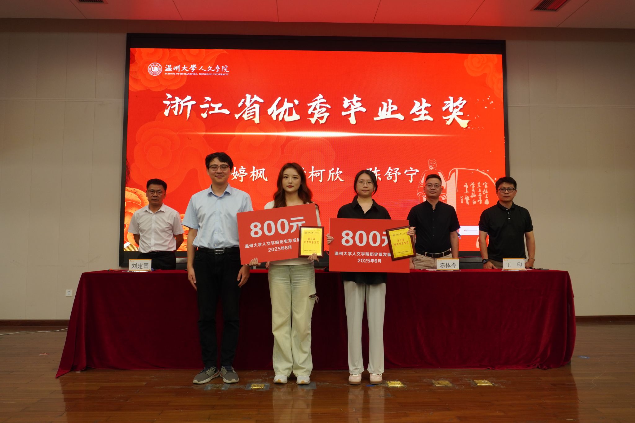 院党委副书记黄玮宣布获奖名单,各位领导嘉宾分别为优秀毕业论文奖、优秀学术成果奖、优秀学科竞赛奖、考研升学贡献奖、浙江省优秀毕业生奖、国家奖学金奖以及教师特别贡献奖获得者颁奖。获奖师生依次上台领奖。陈鸿超老师宣读2025年通报表扬名单,表彰先进,树立榜样