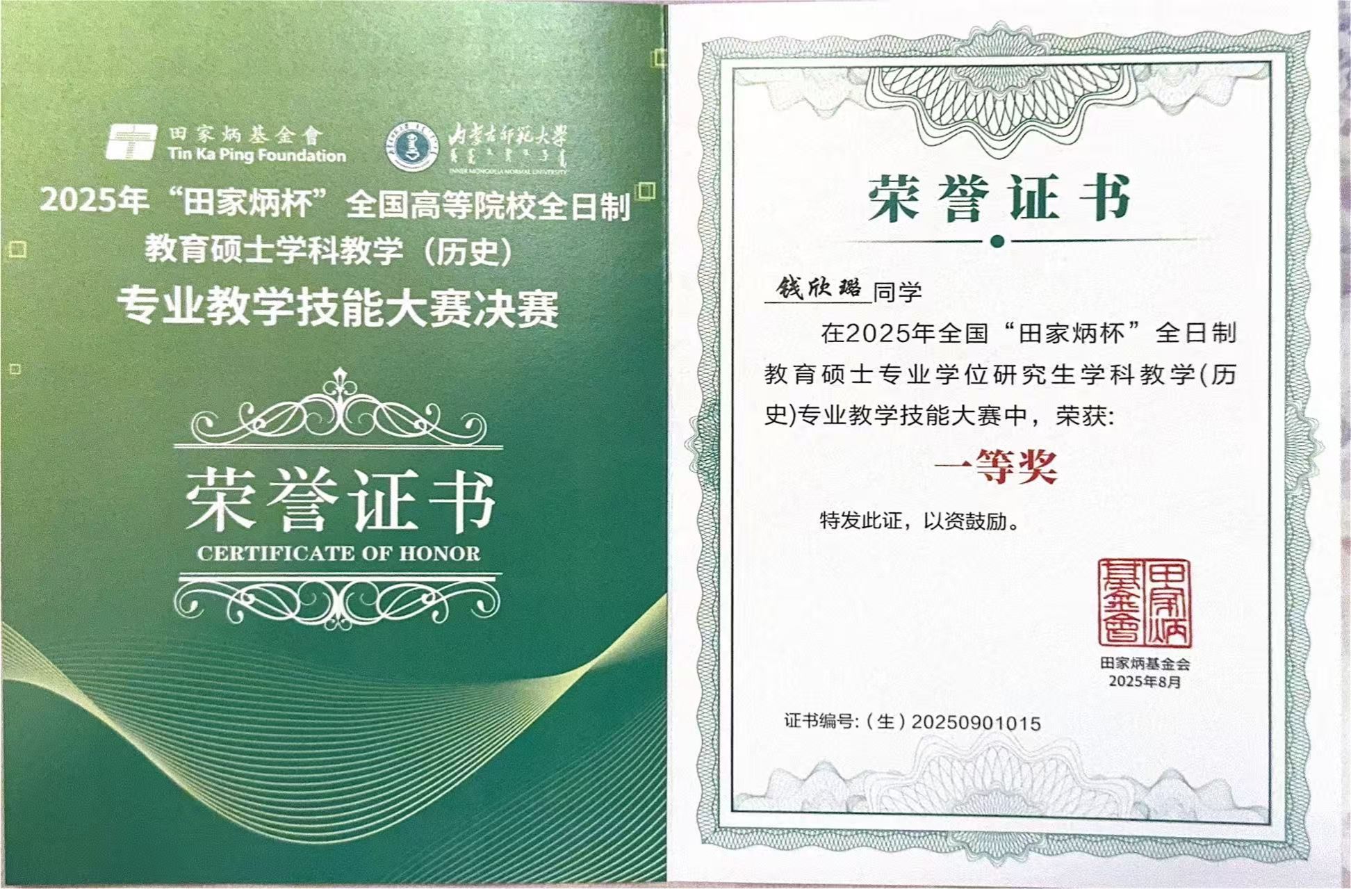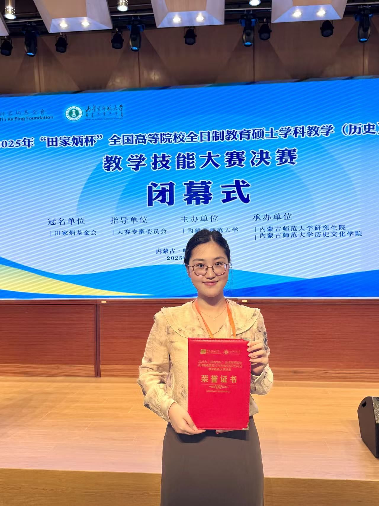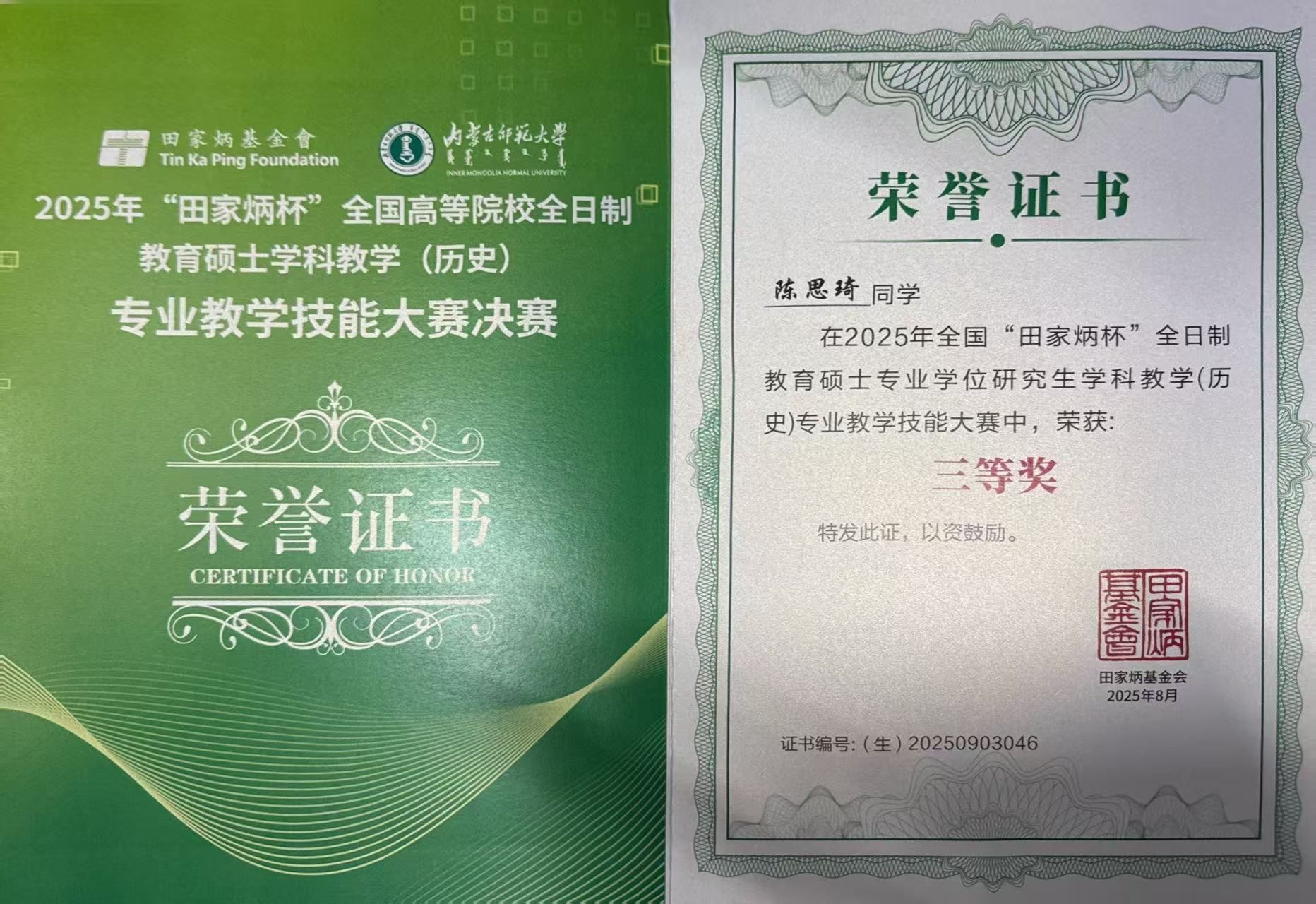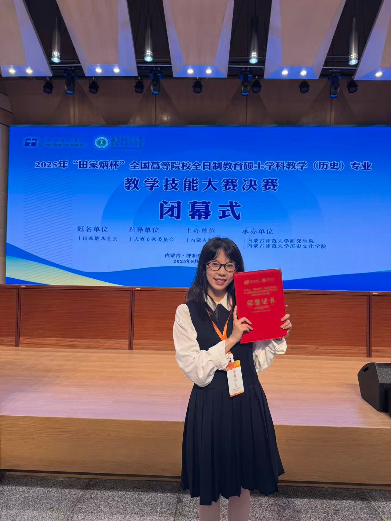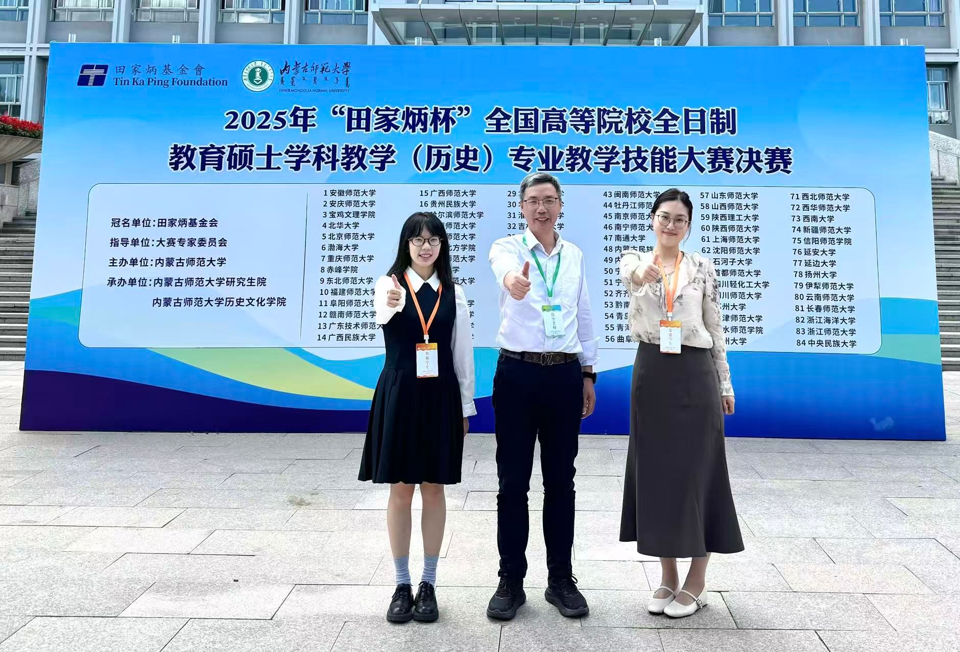 2025年8月22日至26日,2025年全国 “田家炳杯”全日制教育硕士专业学位研究生学科教学(历史)教学技能大赛决赛在内蒙古师范大学举行。该项赛事由全国教育硕士专业学位指导委员会指导,田家炳基金会冠名,内蒙古师范大学主办,吸引了来自北京师范大学、华东师范大学、华中师范大学等全国84所高校的160余名选手参赛。樱花小说 历史系学科教学(历史)研究生由蒋金崇教授带队参赛,并在决赛中取得优异成绩,23级研究生钱欣璐、24级研究生陈思琦分别荣获一等奖和三等奖,祁刚博士获“优秀指导教师”奖。
