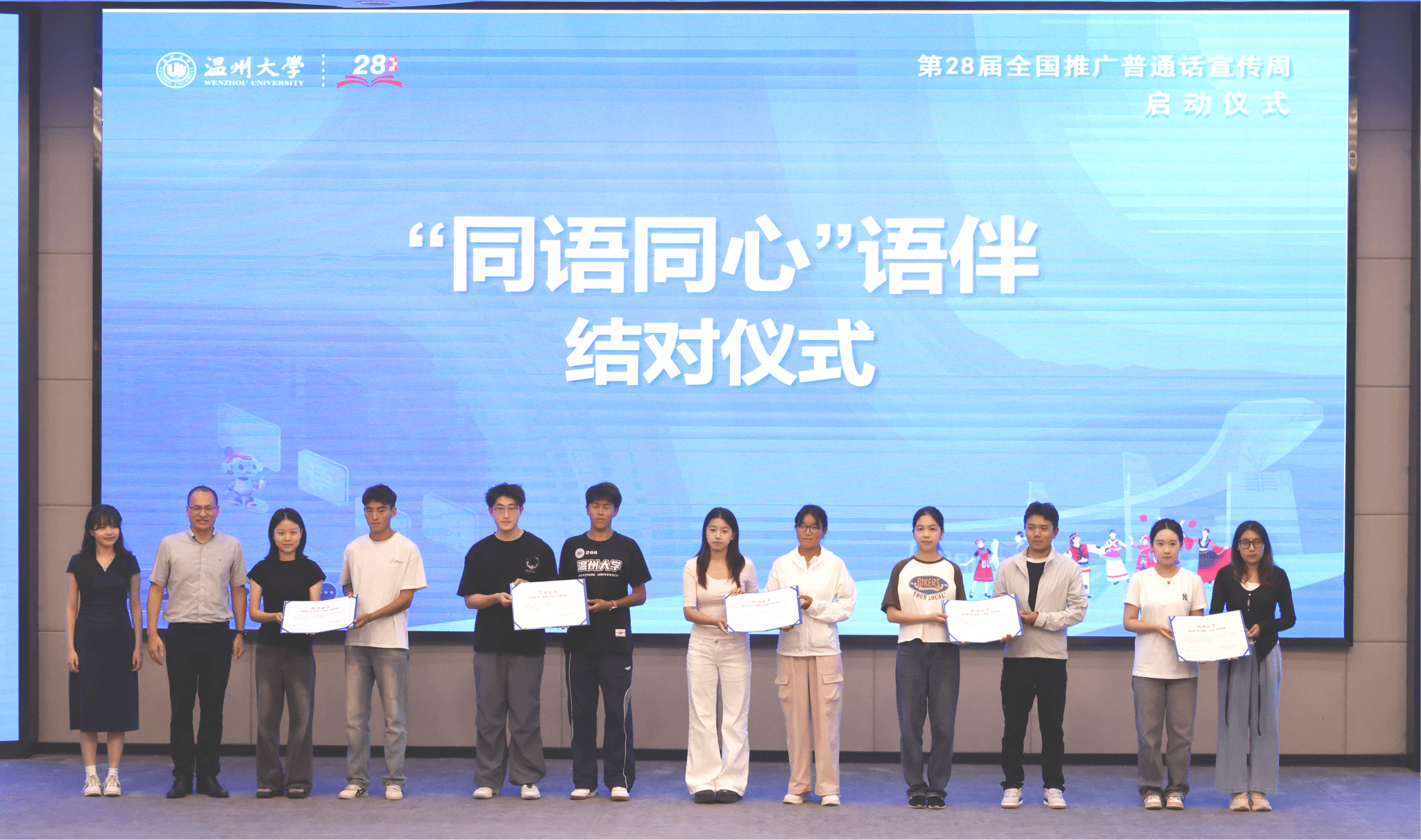 启动仪式上举行了“同语同心”语伴结对活动,10位少数民族和汉族同学结成对子,共同学习、提高普通话水平。温州市教育局基教处吴永远处长为这10位同学颁发证书,勉励同学们学好普通话,加强交流交流沟通、凝聚民族情谊。学生代表余佳豪同学宣读了推广普通话倡议书,号召全校师生积极推广国家通用语言文字,以实际行动促进校园文明建设。
