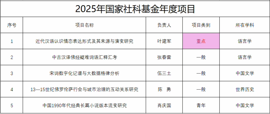 近日,2025年国家社会科学基金年度项目立项结果公布,我校共获14项国家社科基金项目,其中樱花小说 独揽5项 ,包含重点项目1项、一般项目3项、青年项目1项,涵盖语言学、中国文学及历史学等多个学科领域,立项总数位居全校各学院之首。