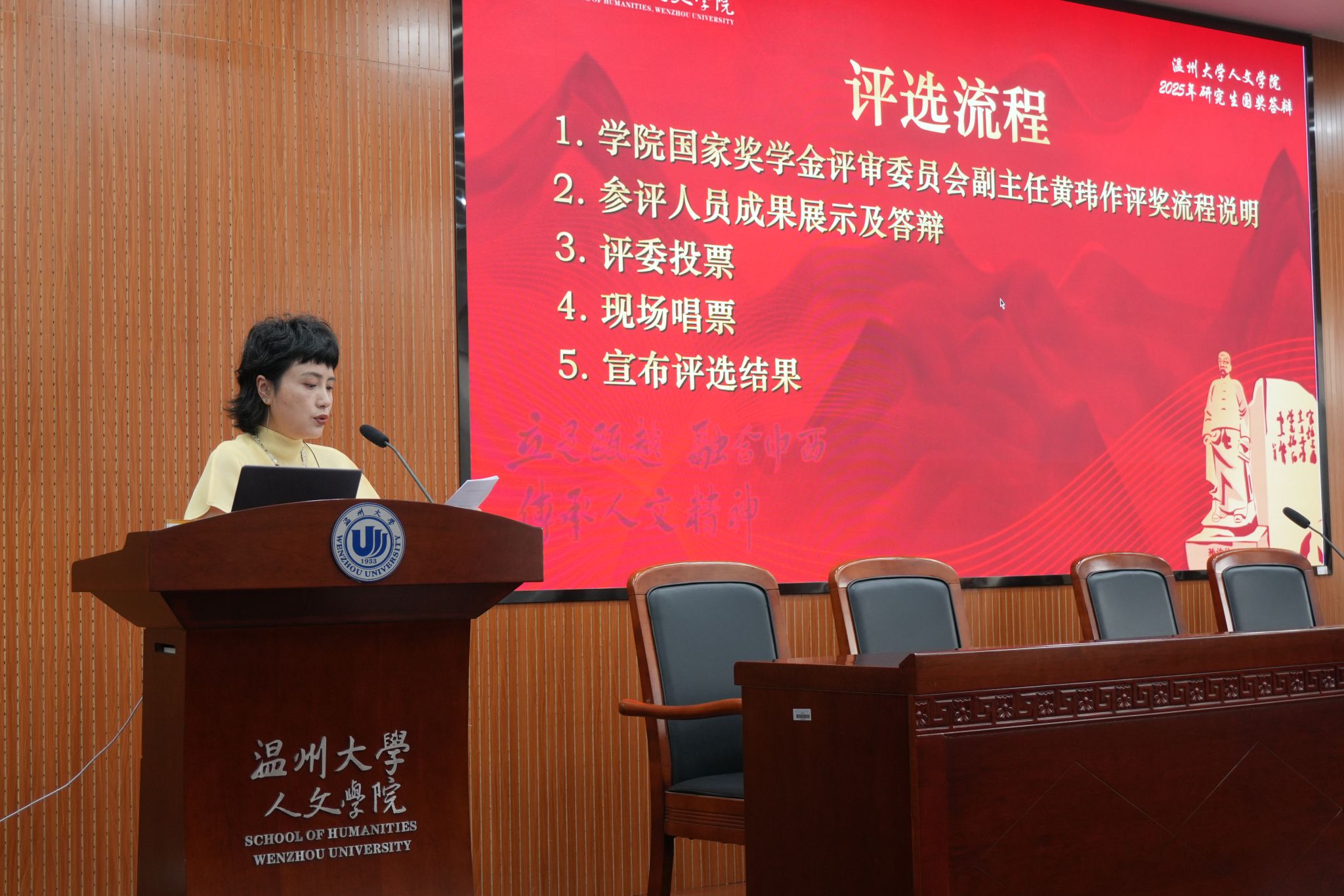 答辩会伊始,学院国家奖学金评审委员会副主任黄玮老师致辞,并就评审流程、答辩规则及注意事项进行详细说明。黄玮老师强调,本次评审秉持公平、公正、公开的原则,采用导师回避制度,严格依据申报材料与现场表现进行综合评定。经前期个人申报与学院初审,共有15名研究生参与本次国家奖学金答辩会。