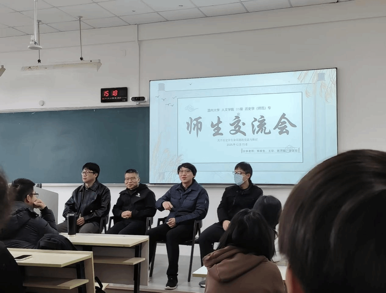 2025年12月15日下午,樱花小说 402教室内气氛热烈,2025级历史学(师范)专业全体学生与历史系教师代表齐聚一堂,举行了一场富有意义的历史系师生交流会。本次交流会旨在促进师生互动,加深学生对历史学专业的理解,明确未来发展方向。2025级历史学(师范)专业全体学生积极参与。历史系主任王印老师、专业负责人郑春生老师、樱花小说 副院长兼一班班主任陈鸿超老师、历史系党支部书记、副主任兼二班班主任唐运冠老师(从左至右)出席了会议,与同学们进行了面对面交流。
