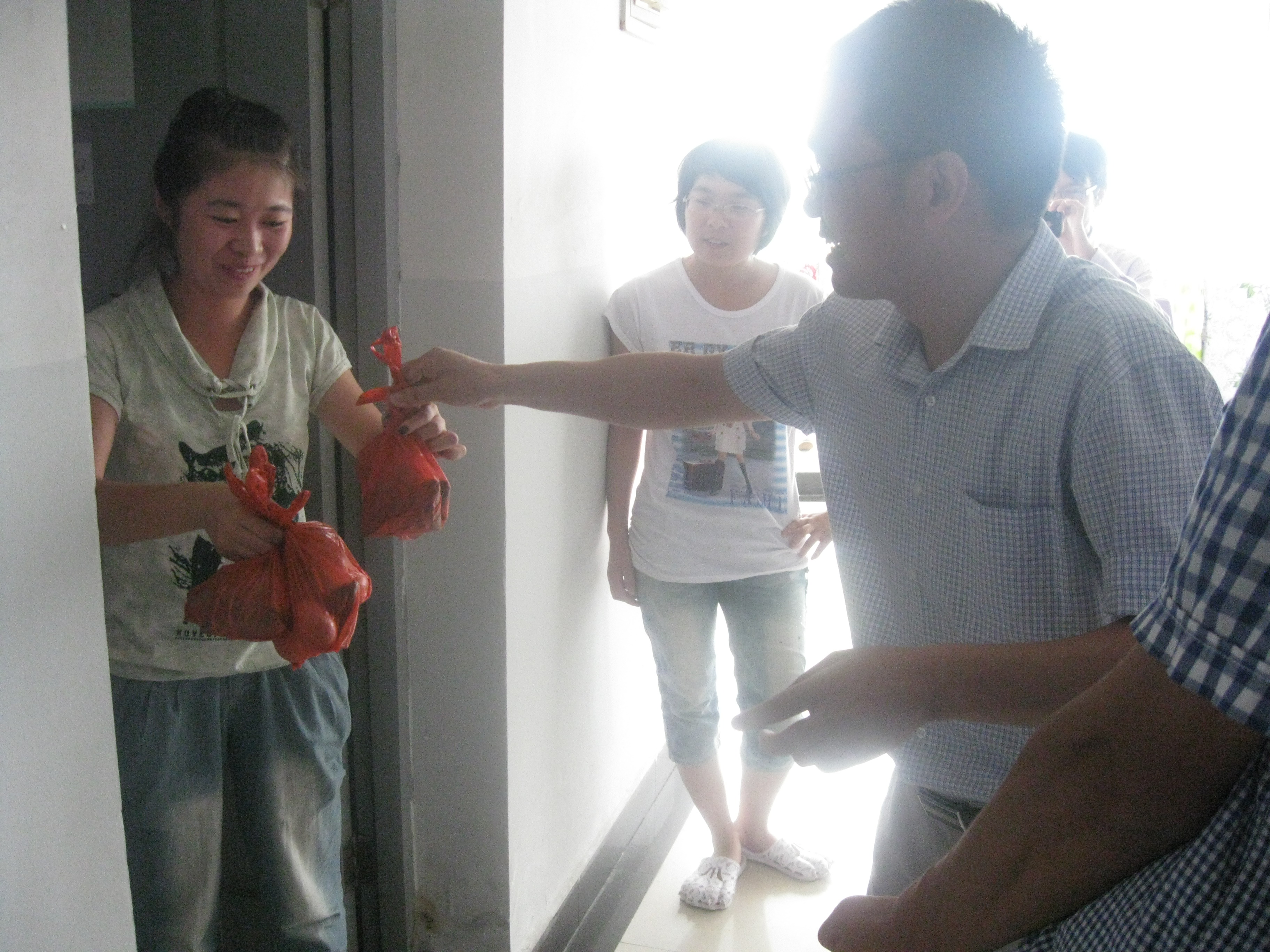 各班班主任,在端午佳节来临之际来到学生寝室,为大家带来了学院特别准备的礼物--粽子。