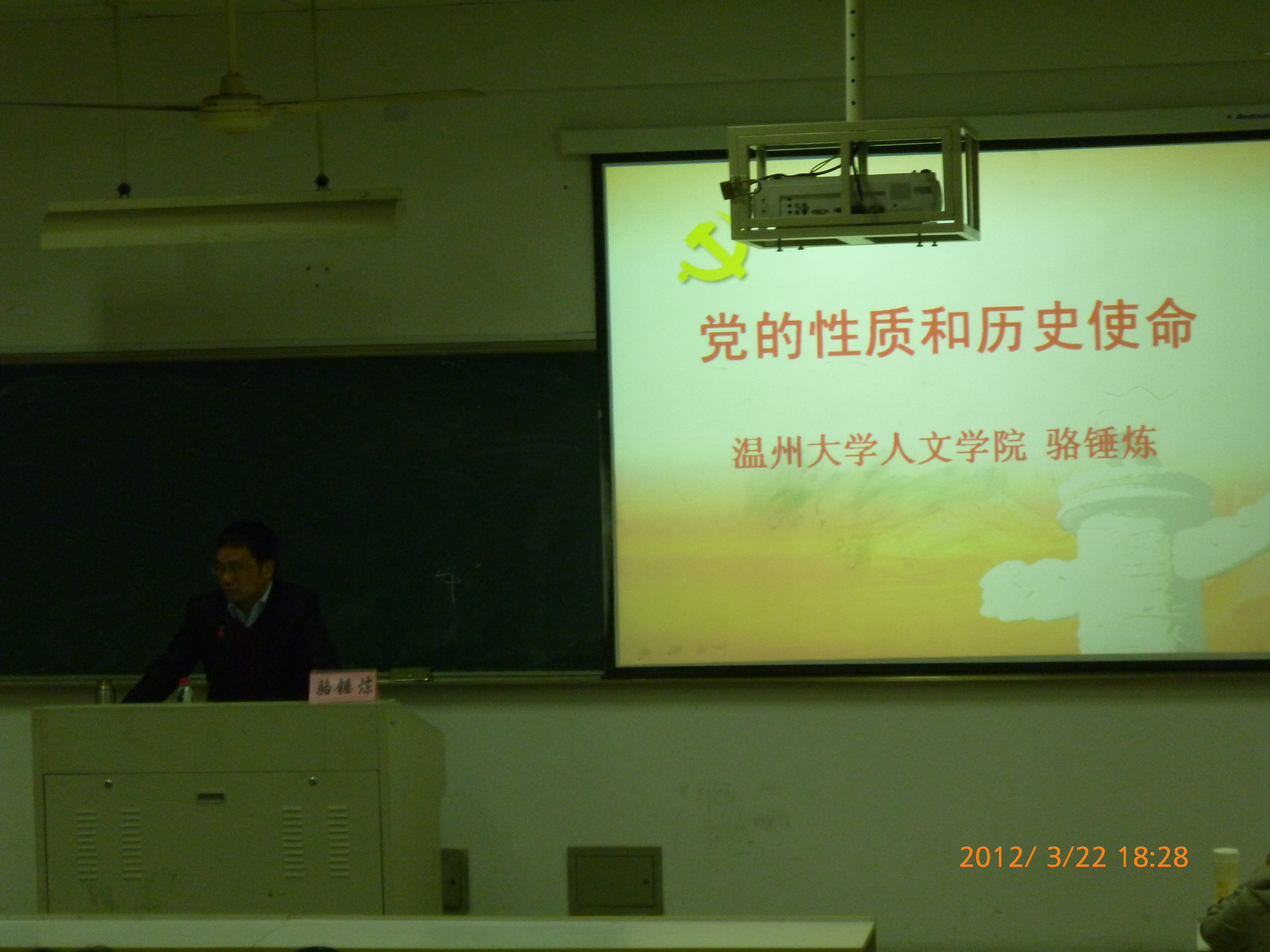 2012年3月22日晚18时30分,樱花小说 第十五期党校培训第二课在1-301开课。樱花小说 党总支副书记骆锤炼老师作为主讲人出席了本次党课。77名党校的学员和党员之家工作人员积极主动地前来聆听讲座。