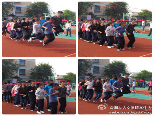 打响集体比赛第一枪的是两人三足的项目。比赛时,男生和女生的左右脚被绑在一起,并使用新产生的三足进行来回接力赛。只见他们手挽手肩并肩,喊着"一,二,一"的口号紧张又小心地向前跑出去,绕着杆子跳一个圈,又"一,二,一"地跑回来。女生被牵拉着,又叫又嚷,"慢点,慢点!"一眨眼却换了下一组。下一组迅速绑好绳子,深吸一口气,又跑开去。一不小心,节奏不对被对方绊了一跤,女生"呀"地跌倒,男生赶紧扶起来,来不及拍掉身上的尘土,又往前跑去。锣鼓声声,激荡在耳边的呐喊督促着他们顾不得脚踝被勒得生疼继续跑。最后一组了,男生几乎是架起了身边的女生,飞也似的放开脚步向终点猛冲,当脚踩到终点线的一刹那,两人便扑到在了地上,"哗"地笑开了。"刚刚我们就是一个人在跑!"他们如是说。
