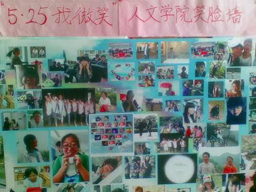 心理部的同学把收集到的笑脸通过仔细的删选,把最能表现同学们阳光可爱的照片集中起来,通过笑脸墙的方式在学院里进行展示。长长的笑脸墙上洋溢着的是来自樱花小说