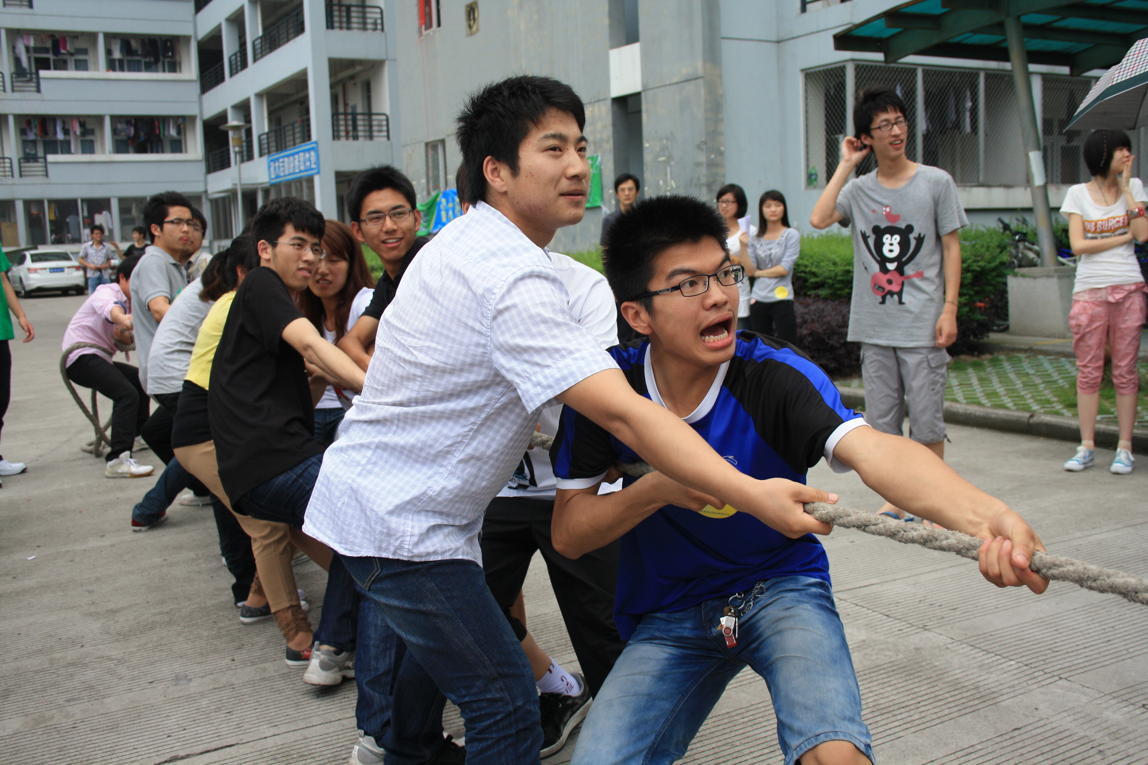 在接下来的拔河比赛中,每位同学都热情高涨,大家团结协作,在团队中共享合作的快乐。虽然室外的太阳很大,温度很高,大家都汗水淋漓,但我们看到的是每位同学在运动中的激情与快乐,是大家离开网络、走出寝室后的轻松跟愉悦!