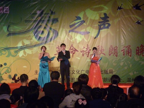 4月23日晚,温州市“春之声”大型革命红色诗歌朗诵会在温州市图书馆前广场隆重举行。在世界阅读日这个特殊的日子,用革命红色诗歌朗诵的方式庆祝建党九十周年、辛亥革命一百周年,倡导全民阅读。温州市文化广电新闻局及温州市图书馆相关领导出席,来自附近社区的1000余名群众观看了晚会。