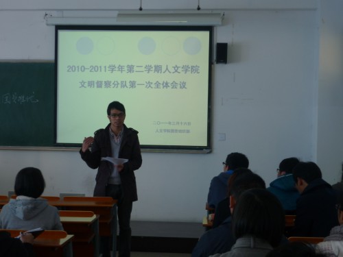 团委组织部负责,辅导员麻法全老师出席,文明督察队的各成员参加。