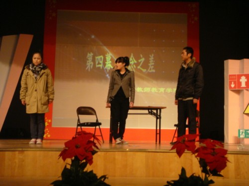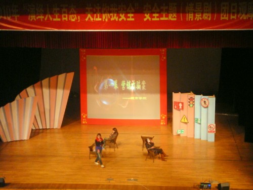 保卫处副处长张有全老师做了简短的校园安全形势通报,呼吁广大同学提要防范意识,增强技能,做好校园安全工作。接下来进行的是精彩的情景剧表演,城市学院表演的《营销诈骗案》讲述了在校大学生为经不住骗子高额创业回报幌子下的诱惑,向同学借钱购买了"海飞丝"洗发水的故事;而瓯江学院表演的《醉酒之后》,则讲述农村大学生醉酒之后致人轻伤,其母亲为赔付受害学生人身损害赔偿以至卖地筹资境况的故事,不过故事结尾双方达成和解的也体现了大学生相亲相爱一家人的主旋律;音乐学院表演的《球场风波》、教师教育学院表演的《一念之差》从不同角度揭示了校园财产安全隐患,呼吁广大同学提高警惕妥善保护自己财产;最后出场的是樱花小说