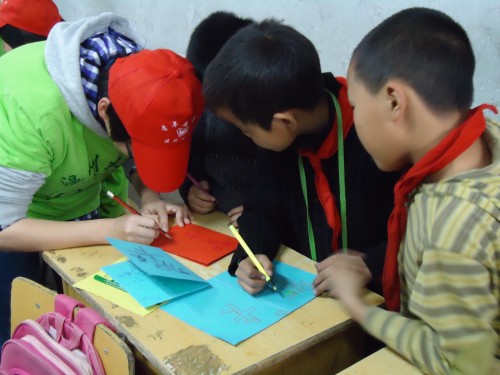 志愿者决定做关于感恩的活动--教小朋友们为父母做贺卡,送祝福。中午时分,各学院志愿者们与C区集合,一同前往丁岙。去丁岙的一路上可谓艰辛,由于路途较远,交通状况较差,志愿者们经过较长时间颠簸才到达目的地。但一到学校,看到可爱的乖巧的孩子们,志愿者们便疲乏全无,立刻开展起活动。活动伊始,志愿者们先做好了准备工作:贴海报、分组、发卡纸等,一切都有序的进行。在教小朋友做贺卡的过程中,志愿者们耐心而热情,边与小朋友聊,边协助小朋友们做,可谓其乐融融、相亲相爱。小朋友们之间也能互相帮助,传借工具、帮剪纸片、出主意......各位小朋友似乎都想把送给父母的贺卡做成世界上最漂亮的。真的是用心在制作,相信孩子父母看到会很感动的。