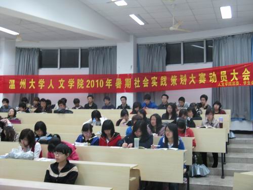 首先,辅导员麻老师发表讲话。他结合学生时代参加的暑期社会实践经历,谈了个人看法,并为大家提供时下的热点话题,供大家选题。他重点强调选题应与专业相挂钩,遵循“受教育,展才干,做贡献”的原则,使同学们把握了大方向。之后, 08届优秀实践队--樱花小说 “丽岙侨乡和谐行”暑期社会实践队和樱花小说 “景宁畲乡支教”暑期社会实践队这两支队伍与大家一起交流分享了写策划的经验。代表们详细认真的介绍和经验传授,让在场09届学生踌躇满志,跃跃欲试。20:30左右,动员大会顺利结束。