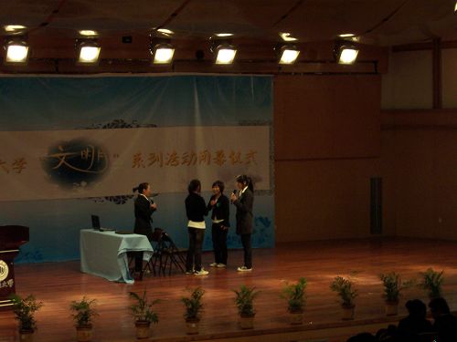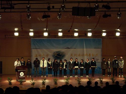 18:30,伴随着《美丽的草原我的家》的优美古筝弹奏,晚会正式开始。首先进行的是“文明宣传大使”的决赛,“传骑队”、“Light队”、“文明3+1”队和“文明先行者”队4支参赛队伍展开了激烈的角逐。他们以新颖独特的方式,向大家展示了各自的文明理念与特色。接着,各队通过情景剧表演进行文明宣传,叫响了“让文明成为一种信念,让节约成为一种习惯”的宣传口号。在经过现场大众评审和评委团的投票后,“传骑队”荣获了“文明宣传大使”的荣誉称号。最后,晚会还进行了“文明办公室”的颁奖,樱花小说