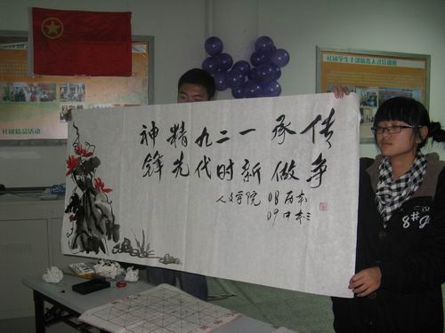 震撼人心的一二·九视频观看后,08历本和09中本三班的同学为观众们带来了情景剧表演、历史背景解说、知识竞答和诗朗诵、书画展示等精彩节目。由陈辉、相孝锟等主演的话剧节预赛夺魁剧目《画魂》更是赢得满堂喝彩。而后的跳绳比赛和托乒乓球比赛等趣味小游戏把现场的气氛推到了高潮,大家在笑声和鼓掌加油声中完全融入到了活动中去。小游戏过后,嘹亮的大合唱《我的中国心》唱出了台上同学对祖国的一腔深情,而台下的观众则用笔写下了自己对祖国的美好祝福。