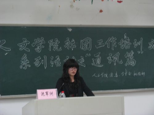 社团工作培训交流活动在人文楼201教室准时举行。此次培训的主要内容是通讯写作。校新闻联合会秘书长、原《樱花小说