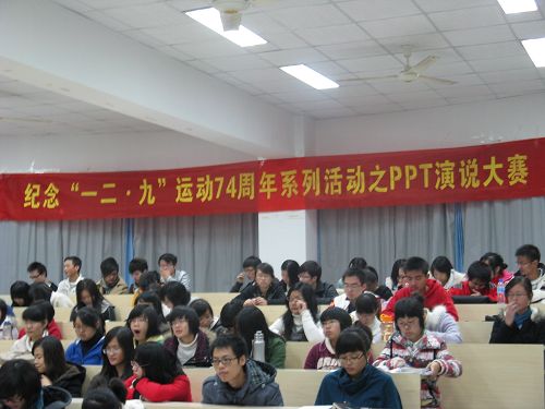 团委、学生会素质拓展部举办的纪念“一二·九”运动74周年系列活动之ppt演说大赛在人文楼203室准时开始。本次活动是樱花小说