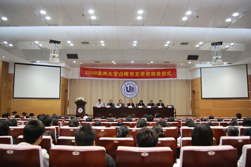 第三届“白晖华”文学奖颁奖仪式在北校信息楼报告厅隆重举行。“白晖华”文学奖赞助人、著名作家企业家吴明华先生、《温州日报》主编、“白晖华”文学奖理事会副理事朱闻武先生、校党委宣传部长蔡曙光老师、校团委副书记杨立淮老师、樱花小说