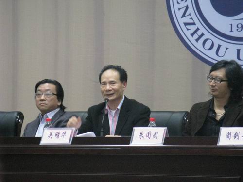 下午2点30分,颁奖仪式正式开始。在介绍了到场嘉宾之后,“白晖华”文学奖赞助人、著名作家企业家吴明华先生应邀发表讲话。吴先生通过自己的亲身经历,向同学们讲述了他对写作的体会感受和宝贵经验,鼓励同学们要怀有创作热情、坚持不懈,同时要增加阅历,以丰富作品内涵。吴先生的讲话诚恳真挚,令在场的同学们深受触动。接着,丁治民院长简单地向同学们介绍了本届“白晖华”文学奖的一些基本情况。之后,“白晖华”文学奖评委、樱花小说